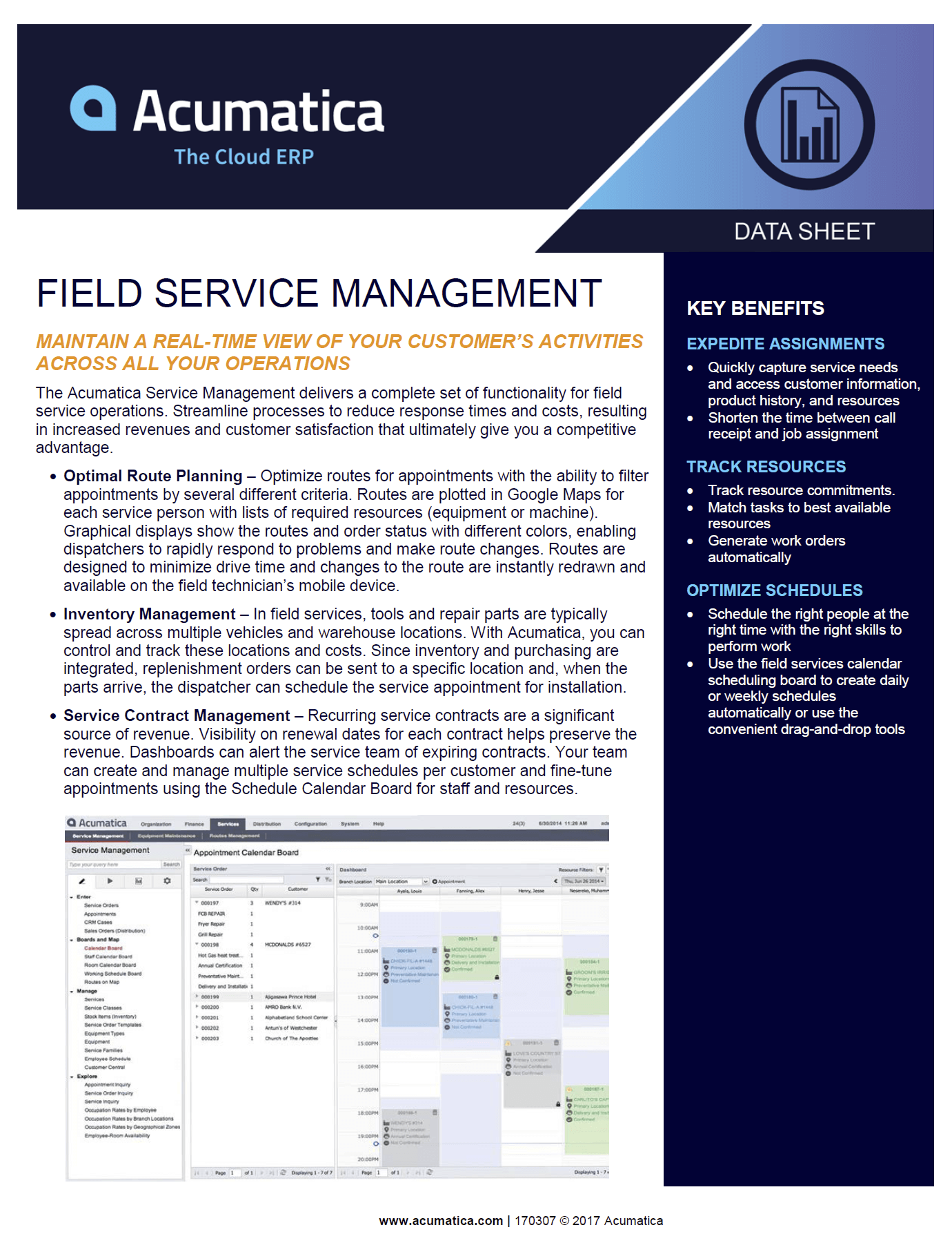 Scheduling the right people at the right time with the right skills to perform work efficiently is handled quickly with Acumatica Field Service Management. Quickly capture service needs and access customer information, product history, and resources required to shorten time between call receipt and job assignment. Create daily or weekly schedules automatically or using drag-and drop tools on the graphical dispatch board utilizing colors to identify the status of each service order.